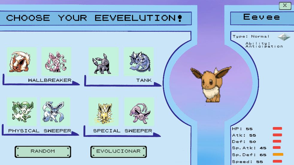 Eevee Selector is a small fanmade project developed for a university assignment. It allows you to choose any Eeveelution or generate one at random. Once selected, the evolution will display its animation, sound and basic info.